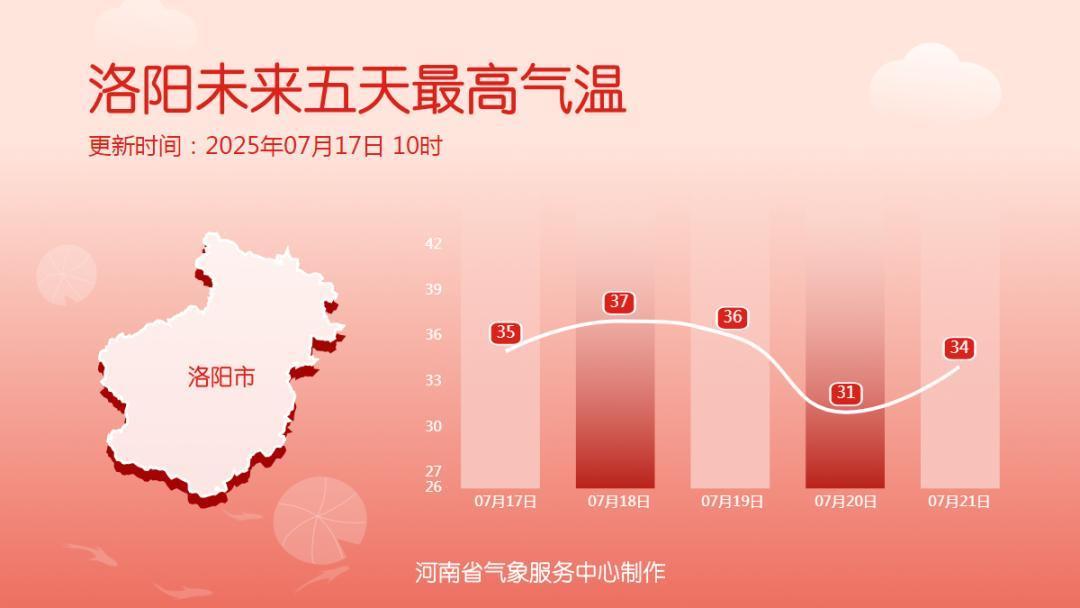 而高温天气想要彻底瓦解,仅靠短暂的降水还远远不够,好消息是目前在菲律宾以东洋面,有一个热带低压(“入门级”台风)正在壮大并逐渐向我国靠近,尽管它不会直接奔向河南,但受其外围环流影响,下周一开始,一轮大范围降水即将登场,浇灭高温指日可待! 未来三天天气预报今天下午到夜里,安阳西部、鹤壁、新乡西部、三门峡、洛阳、南阳、信阳多云,有分散性阵雨、雷阵雨,局地伴有短时强降水、雷暴大风等强对流天气;其他县市晴天间多云。中部、西部部分县市最高气温37到39℃。明天,西部多云,有分散性阵雨、雷阵雨;其他县市晴天间多云。19日,西部、西北部、东部多云,有分散性阵雨、雷阵雨;其他县市晴天到多云。18到19日,北中部最高气温37到39℃,局部可达40℃。20日,全省多云转阴天,有分散性阵雨、雷阵雨,其中西部、东部部分县市有中雨,局部大雨或暴雨并伴有雷暴大风、短时强降水等强对流天气。中东部、东南部部分县市最高气温37到39℃,局部40℃左右。来源 | 河南发布 河南气象